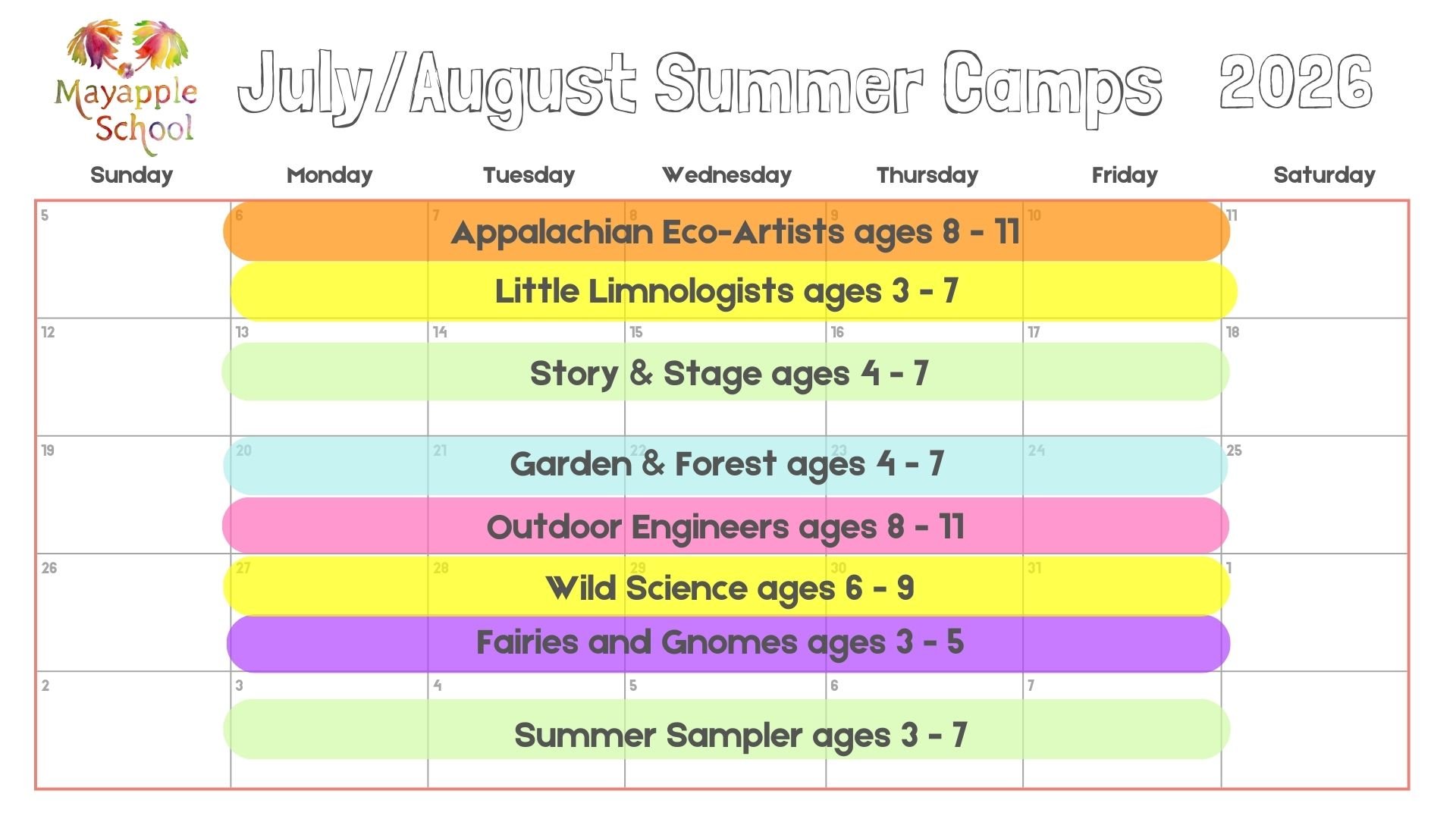 Take a look at this Summer’s camps at The Mayapple School at 2895 Old Fort Rd, near our beloved Price Park and start dreaming about summer fun!